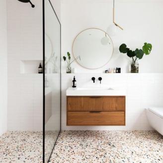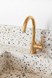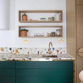 Avec toutes ses qualités, le terrazzo s'adapte partout. Dans les travaux de rénovation, on l'imagine bien-sûr dans la salle d'eau pour son imperméabilité. Résistant à la chaleur, on l'utilise aussi volontiers en guise de plan de travail. Mais il existe une multitude d'autres possibilités : marches d'escalier, crédence, vasque de lavabo ou même piscine. Soyons inventifs ! Pour éviter la lassitude, on le préfère par petites touches. Associé à du bois, du laiton, ou des couleurs pastels, il se mariera à merveille.