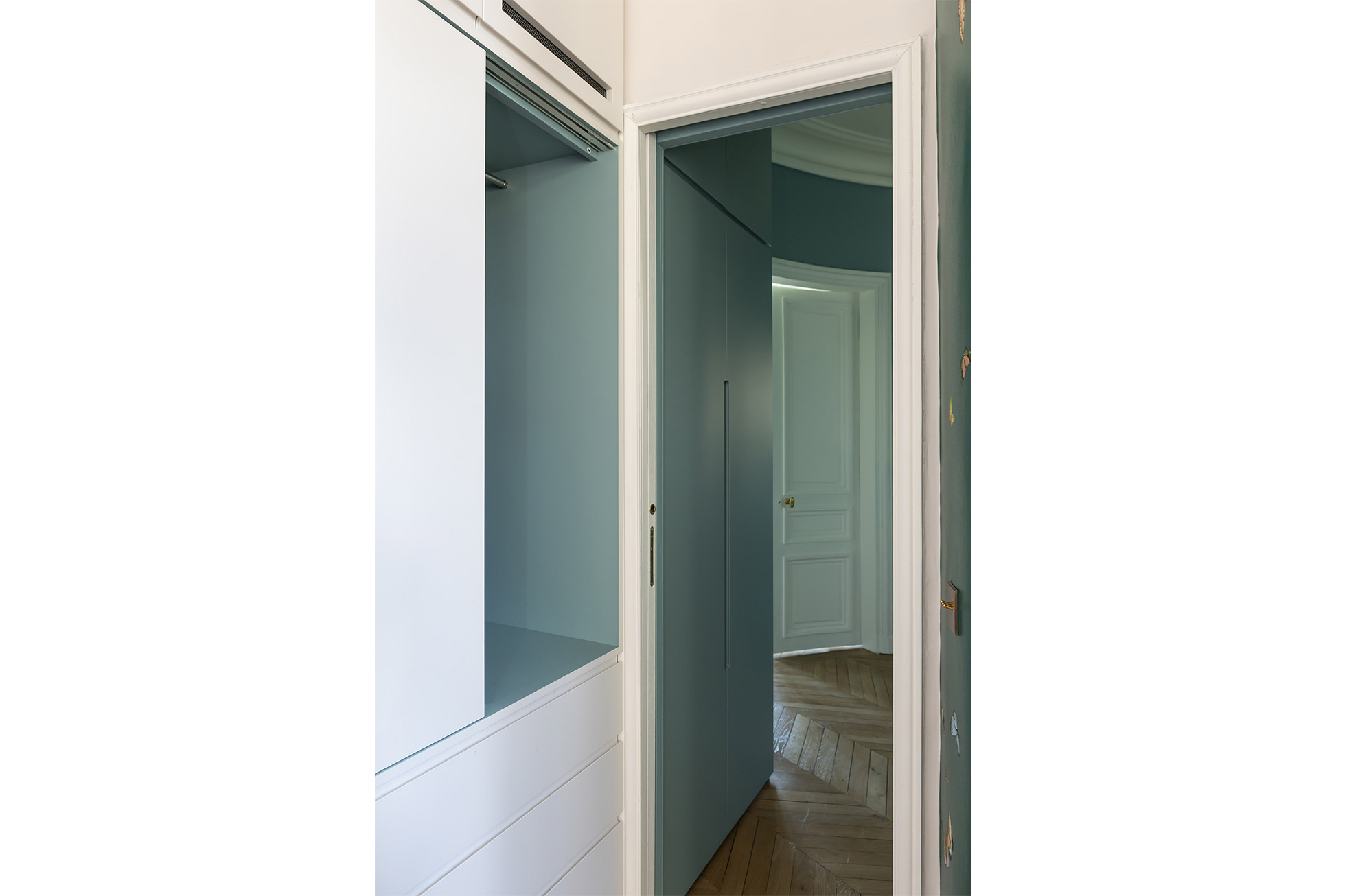 We recreated woodwork for the curved hallway and shifted the access to the second bathroom.