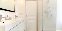 Salinesi Parisian-Interiors a effectué des travaux de rénovation dans cet appartement au fort potentiel. Afin d'optimiser l'espace, nous avons procédé à la dépose de cloisons, et notamment celle qui séparait le couloir et le salon. Un percement a également été créé dans le mur séparant la cuisine du salon afin de pouvoir y insérer une verrière. Pour les sols, du carrelage a été installé dans la cuisine et le parquet a été restauré, et pas moins de 5 couches de vernis brillant ont été appliqué. Une salle de bain surélevée a été créée entre les deux chambres, ayant chacune un accès grâce à des portes coulissantes. Dans la salle de bain une grande douche a été installée avec des une paroi de douche sur mesure. Dans l'appartement, les huisseries ont été changées et des travaux en électricité et plomberie ont été également réalisés. Au final, un appartement lumineux, fonctionnel et décoré avec goût ! Pour le plus grand bonheur de nos clients !