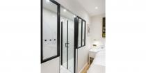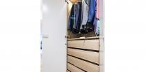 Le couloir d’entrée donne accès aux toilettes, à deux placards dressing/vestiaire et à la chambre du client. Fermés, les placards sont quasiment invibles.