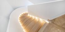 Au Plafond, des rails d’éclairage ERCO associés avec de longues dalles LED pour un effet lumière du jour.