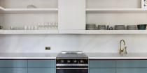 Enfin, la cuisine sur-mesure en deux tons avec crédence et plan de travail en Silestone calacata et piano Lacanche.